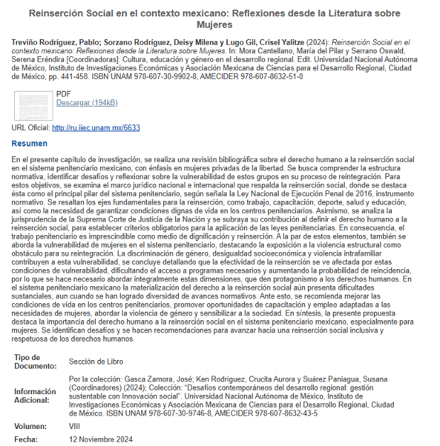 En el presente capítulo de investigación, se realiza una revisión bibliográfica sobre el derecho humano a la reinserción social en el sistema penitenciario mexicano, con énfasis en mujeres privadas de la libertad. Se busca comprender la estructura normativa, identificar desafíos y reflexionar sobre la vulnerabilidad de estos grupos en su proceso de reintegración. Para estos objetivos, se examina el marco jurídico nacional e internacional que respalda la reinserción social, donde se destaca ésta como el principal pilar del sistema penitenciario, según señala la Ley Nacional de Ejecución Penal de 2016, instrumento normativo. Se resaltan los ejes fundamentales para la reinserción, como trabajo, capacitación, deporte, salud y educación, así como la necesidad de garantizar condiciones dignas de vida en los centros penitenciarios. Asimismo, se analiza la jurisprudencia de la Suprema Corte de Justicia de la Nación y se subraya su contribución al definir el derecho humano a la reinserción social, para establecer criterios obligatorios para la aplicación de las leyes penitenciarias.