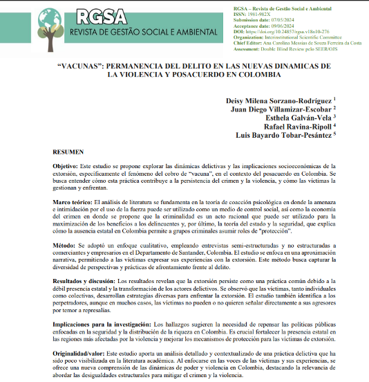 Objective: This study aims to explore the criminal dynamics and socioeconomic implications of extortion, specifically the “vacuna” (protection payment) phenomenon, in Colombia. It seeks to understand how this practice contributes to the persistence of crime and violence, and how victims manage and cope with this form of violence. Theoretical Frmework: The literature review is based on the theory of psychological coercion, where the threat and intimidation through force are used as a means of social control, as well as the economics of crime, which proposes that criminality is a rational act aimed at maximizing benefits for offenders. Finally, the theory of the state and security explains how the absence of the state in Colombia allows criminal groups to assume roles of “protection.” Method: A qualitative approach was adopted, using semi-structured and unstructured interviews with merchants and business owners in the Department of Santander, Colombia. The study focuses on a narrative approach, allowing victims to express their experiences with extortion. This method aims to capture the diversity of perspectives and coping practices in response to the crime.