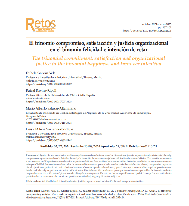El objetivo de este estudio fue analizar empíricamente las relaciones entre las dimensiones justicia organizacional, satisfacción laboral y compromiso organizacional con la felicidad laboral y la intención de rotar en trabajadores del ámbito docente en México. Con este fin, se encuestó a una muestra de 393 profesores de educación superior en México. Para analizar los datos se utilizó la técnica estadística de ecuaciones estructurales por CB-SEM. Los resultados alcanzados de este estudio muestran, por un lado, que las variables satisfacción laboral, compromiso organizacional y justicia organizacional están relacionados entre sí en este tipo de trabajadores, y por el otro, que estas variables explican positivamente la felicidad laboral y negativamente la intención de rotar.