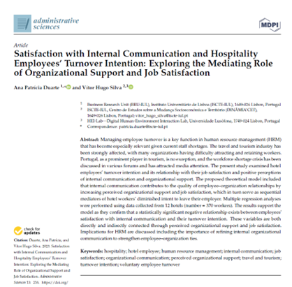 Managing employee turnover is a key function in human resource management (HRM) that has become especially relevant given current staff shortages. The travel and tourism industry has been strongly affected, with many organizations having difficulty attracting and retaining workers. Portugal, as a prominent player in tourism, is no exception, and the workforce shortage crisis has been discussed in various forums and has attracted media attention. The present study examined hotel employees’ turnover intention and its relationship with their job satisfaction and positive perceptions of internal communication and organizational support. The proposed theoretical model included that internal communication contributes to the quality of employee–organization relationships by increasing perceived organizational support and job satisfaction, which in turn serve as sequential mediators of hotel workers’ diminished intent to leave their employer. Multiple regression analyses were performed using data collected from 12 hotels (number = 370 workers).