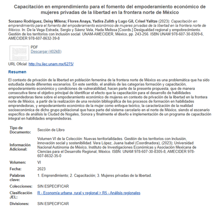 El contexto de privación de la libertad en población femenina de la frontera norte de México es una problemática que ha sido estudiada desde diferentes escenarios. En este sentido, el análisis de las categorías formación y capacitación, empoderamiento económico y condiciones de vulnerabilidad, hacen parte de la presente propuesta, que de manera consecutiva tiene el objetivo principal de identificar el efecto que la capacitación para el desarrollo de habilidades emprendedoras tiene sobre el empoderamiento económico de mujeres en contexto de privación de la libertad en la frontera norte de México, a partir de la realización de una revisión bibliográfica de los procesos de formación en habilidades emprendedoras, y empoderamiento económico de la mujer como enfoque teórico, la caracterización de la realidad socioeconómica de dicho grupo poblacional que hace parte del sistema carcelario en el norte de México, siendo el escenario específico de análisis la Ciudad de Nogales, Sonora y finalmente el diseño e implementación de un programa de capacitación integral en habilidades emprendedoras.