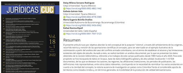 El presente artículo tuvo por objetivo abordar la red conceptual de la acepción “víctima”, a través del señalamiento de los orígenes, recorrido teórico y revisión de las aportaciones científicas al concepto, para ser aterrizado en el ejemplo ilustrativo de la victimización a partir del análisis del caso del conflicto armado colombiano, con el ánimo de establecer el alcance y las limitaciones existentes del objeto de estudio. Aunado a esto, se realizó también un análisis documental, por lo que se presentan los datos obtenidos de la revisión bibliométrica, referente a los trabajos de este campo publicados desde 1984 hasta el año 2020. Para este propósito se hizo búsqueda de datos en Scopus, base de datos bibliográfica global y de alta calidad, localizando 1 mil 928 documentos, de los que se destacan los autores, las regiones, las afiliaciones instituciones, los periodos de publicación, las definiciones más representativas, entre otros datos relevantes, concluyendo en la necesidad de reivindicar los vacíos existentes en cuanto a la claridad del concepto, la notoria ausencia de investigación en países como Colombia frente al considerable aporte de territorios como Estados Unidos y, en términos generales, la invisibilidad de la producción de calidad latinoamericana.